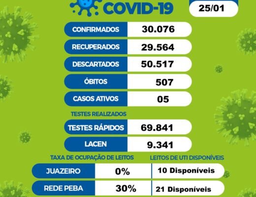 De acordo com o levantamento, 30.076 moradores foram infectados desde o início da pandemia na cidade, dos quais 29.564 já estão recuperados. Os casos descartados somam 50.517. Juazeiro tem 05 casos ativos do novo coronavírus.