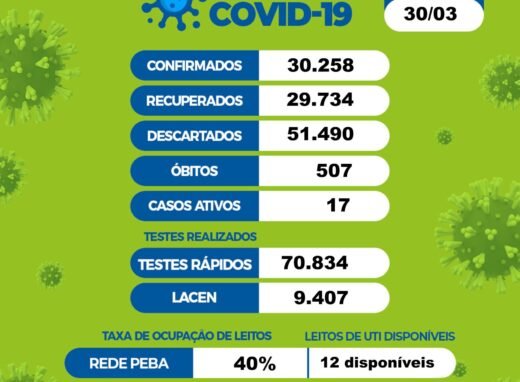 Na rede hospitalar, o percentual de ocupação dos leitos de UTI para Juazeiro na rede PEBA (hospitais de Pernambuco e Bahia) é de 40%, com 12 leitos desocupados.