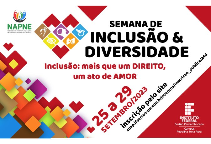 O campus Petrolina Zona Rural do IFSertãoPE realiza, entre estes dias 25 e 29 de setembro, a Semana de Inclusão e Diversidade, promovida pelo Núcleo de Atendimento às Pessoas com Necessidades Específicas (Napne).
