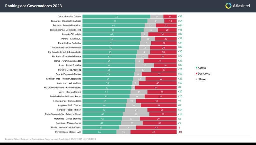O ranking nacional tem como líder o governador de Goiás, Ronaldo Caiado, com 72% de aprovação. Na sequência aparece o governador de Tocantins, Wanderlei Barbosa, com 69% de aprovação. O gestor baiano está na 11ª posição com 56% de aprovação.