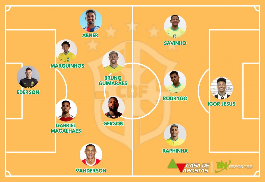 Brasil: Ederson; Vanderson, Marquinhos, Gabriel Magalhães e Abner; Bruno Guimarães, Gerson, Savinho, Rodrygo e Raphinha; Igor Jesus