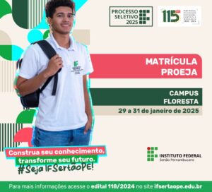 Neste mês de janeiro de 2025, ocorrerão as matrículas dos aprovados no processo seletivo 2025 para os cursos técnicos do Instituto Federal do Sertão Pernambucano (IFSertãoPE). O processo foi regido pelos editais nº 89/2024 e 90/2024 e ofertou 1.920 vagas em cursos nas modalidades Médio Integrado, Subsequente e Proeja, para todas as unidades do IFSertãoPE.