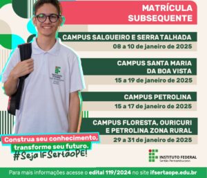 Os editais de matrícula e os calendários de cada campus já foram publicados. As matrículas nos campi Salgueiro, Serra Talhada, Petrolina Zona Rural, Ouricuri e Floresta iniciaram nesta quarta-feira (08).