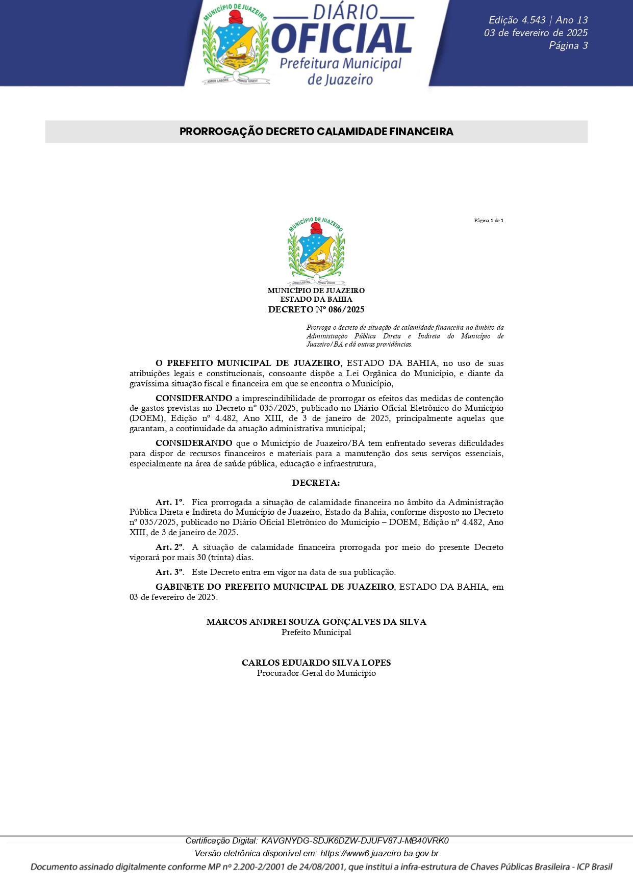 A Prefeitura de Juazeiro prorrogou o decreto n° 035/2025, que dispõe sobre a situação de calamidade financeira no âmbito da administração pública direta e indireta do município. A medida foi publicada no Diário Oficial dessa segunda-feira (3).