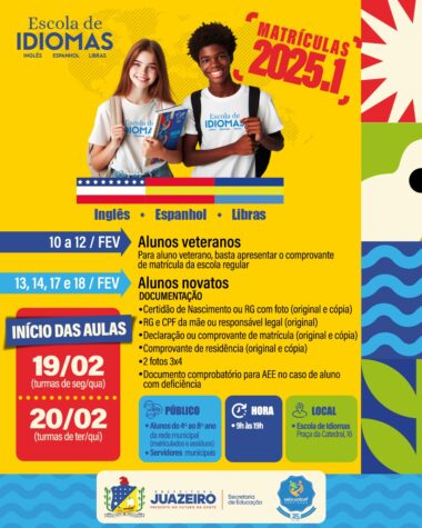 Se você quer aprender Inglês, Espanhol ou Língua Brasileira de Sinais gratuitamente, aproveite esta dica! Começam nesta quinta-feira (13), as matrículas para os novos alunos da Escola de Idiomas de Juazeiro. O espaço, mantido pela Prefeitura, através da Secretaria de Educação (Seduc), atende estudantes que estejam cursando entre o 4º e o 9º ano do Ensino Fundamental na rede municipal de ensino e servidores municipais.