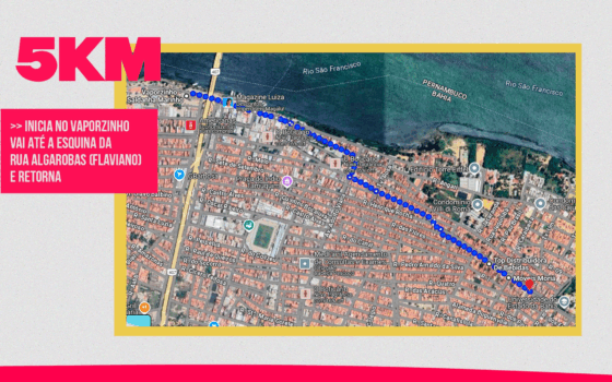 Os corredores dos 5km vão largar do Vaporzinho e seguem pela Avenida Adolfo Viana até alcançarem a Avenida Flaviano Guimarães, onde seguem até a esquina da Rua das Algarobas. É lá que fazem o retorno, voltando pelo mesmo trajeto para cruzar a linha de chegada com vista para o Velho Chico.Já os que vão percorrer a meia maratona (21km), terão o seguinte percurso: a largada será dentro da Agrovale, passando pelo Mercado do Produtor e entrando na pista da BA-210. A corrida segue firme pela Arena Nixon, cruza a frente da Uneb e do Colégio Shalom e desce por Adolfo Viana até a Orla. De lá, é a reta final do rumo à chegada no Vaporzinho.