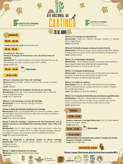 Entre às 10h e 12h, serão ofertadas treze oficinas, com temáticas diversas envolvendo o bioma Caatinga, como, por exemplo, “Receitas com Pancs da Caatinga”; “Produção de lambedor de plantas da Caatinga”; “Fotografias e narrativas visuais do bioma Caatinga”; “Saberes ancestrais da Caatinga” e “A caatinga em impressão 3D”.À tarde, a partir das 13h30, será realizada a palestra “Ameaças à Caatinga”, ministrada pelo professor Dr. Carlos Alberto Batista dos Santos (Uneb). O evento terminará com apresentações de atividades dos núcleos e projetos de Ensino, Pesquisa, Inovação e Extensão do campus Petrolina Zona Rural.