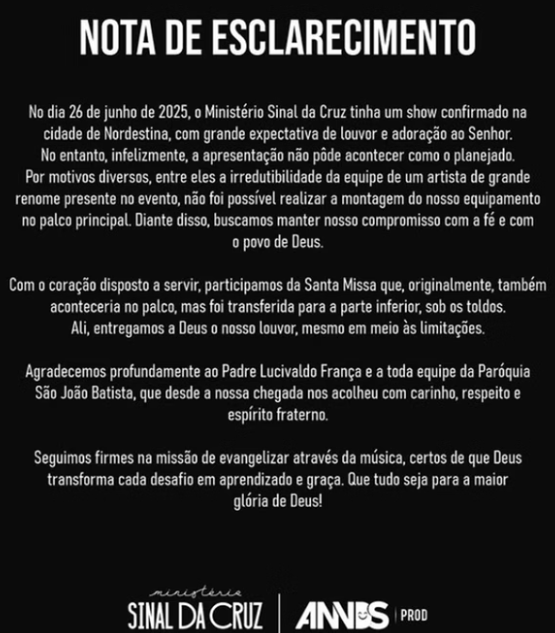 “Foram meses de trabalho intenso, ensaios e preparação para entregar um dos melhores shows da nossa história. Infelizmente, o que vivemos no dia do evento foi decepcionante e frustrante. Como produtor do Ministério Sinal da Cruz, senti que era meu dever esclarecer os fatos, não para atacar ninguém, mas para valorizar a verdade e defender o esforço de todos que fazem parte deste ministério”, afirmou.