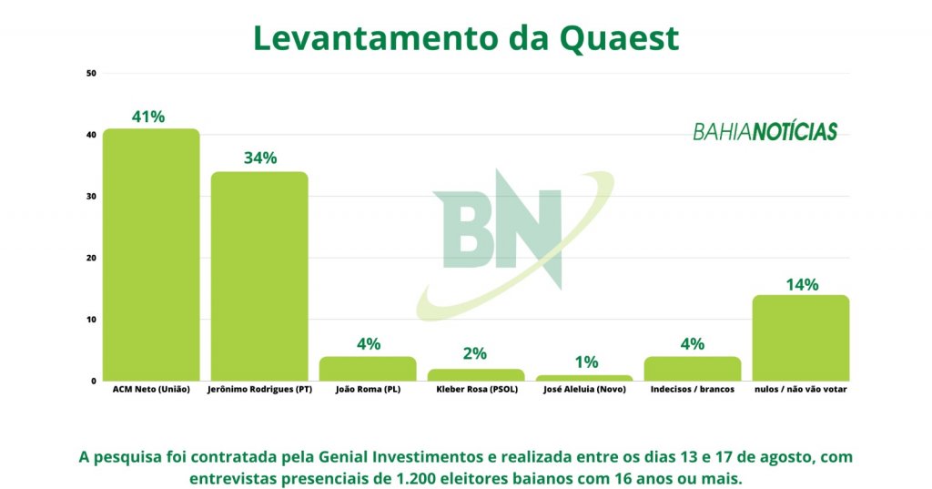 A pesquisa foi contratada pela Genial Investimentos e realizada entre os dias 13 e 17 de agosto, com entrevistas presenciais de 1.200 eleitores baianos com 16 anos ou mais. O nível de confiança é de 95%.