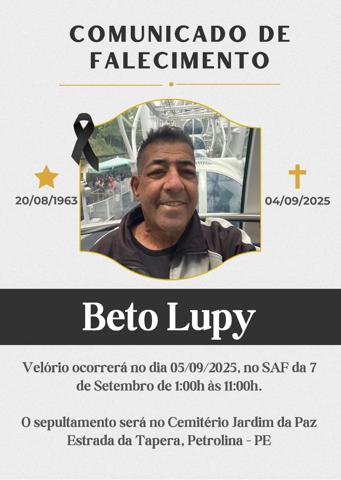É impossível falar desse garotinho, amigo e irmão e conter as lágrimas. Quando falo de Beto lupy,falo de felicidade e muito,mas muito amor ao próximo. Obrigado meu irmão por DEUS ter lhe apresentado a mim e a todos que te amaram aqui na terra. Que JESUS possa te receber com essa mesma alegria que nos contagiou aqui na terra (Eliel)