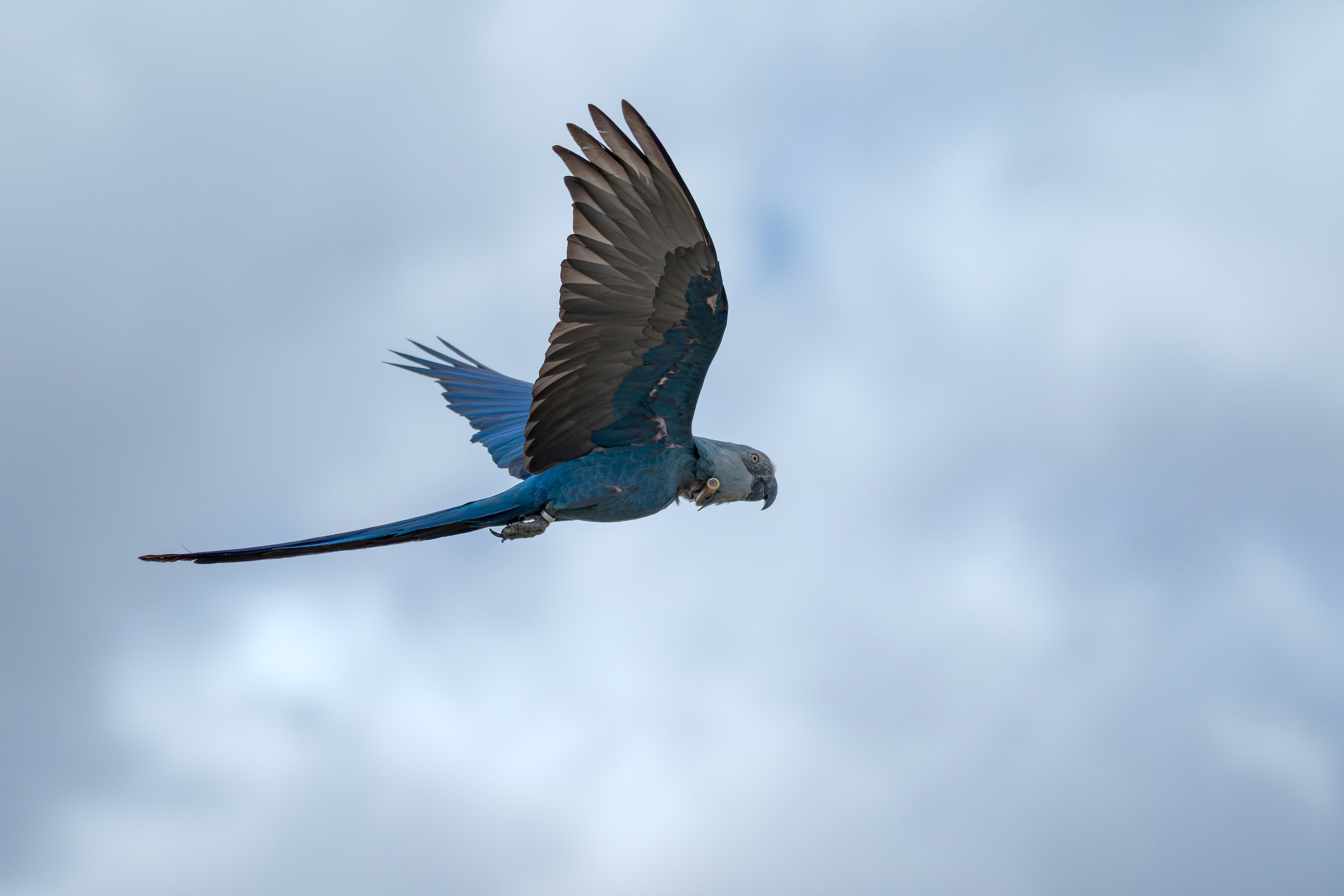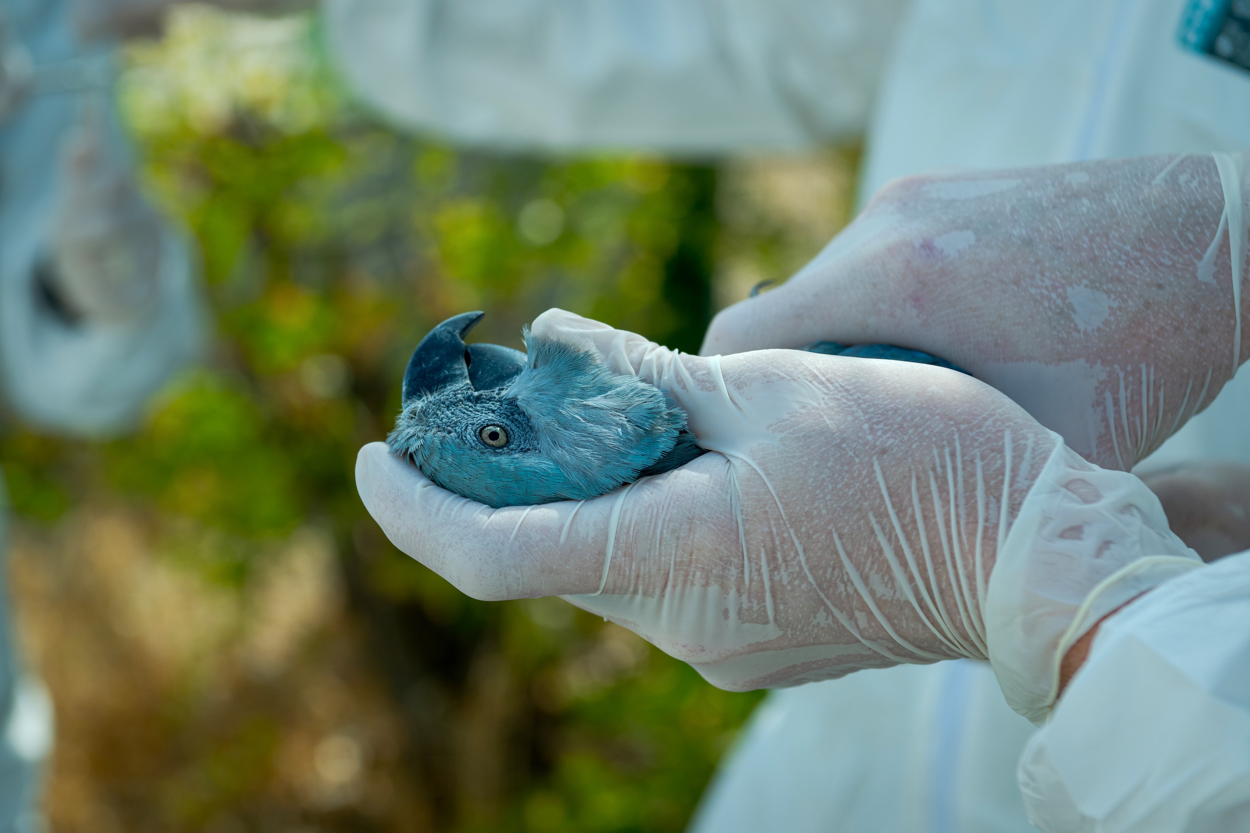 Sob o sol escaldante da Caatinga, grasnados característicos rasgam os céus de Curaçá, alertando para a chegada de uma das aves mais ameaçadas de extinção do mundo. Rapidamente, passam por cima da cabeça silhuetas de um tom de azul inconfundível. Trata-se da ararinha-azul (Cyanopsitta spixii), espécie que no ano 2000 foi declarada extinta na natureza e que hoje é o foco de um projeto de reintrodução. Contudo, ao observar os animais mais atentamente, nota-se que, entre as penas de coloração azul-turquesa, despontam algumas penas brancas.