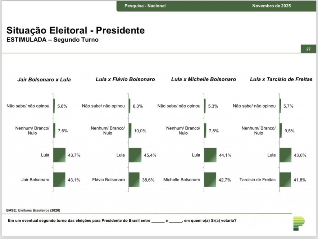 O presidente Luiz Inácio Lula da Silva (PT) lidera todos os cenários de eventuais segundo turno para as eleições de 2026, de acordo com levantamento divulgado nesta terça-feira (11) pelo Paraná Pesquisas.
