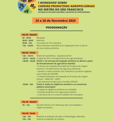 Com foco em temas como a pecuária de corte e leite, fruticultura irrigada, apicultura, piscicultura, caprinovinocultura e agroindústria familiar, o workshop contará com palestras, mesa-redonda, apresentações de casos de sucesso e momentos de integração entre os diversos elos da cadeia produtiva.