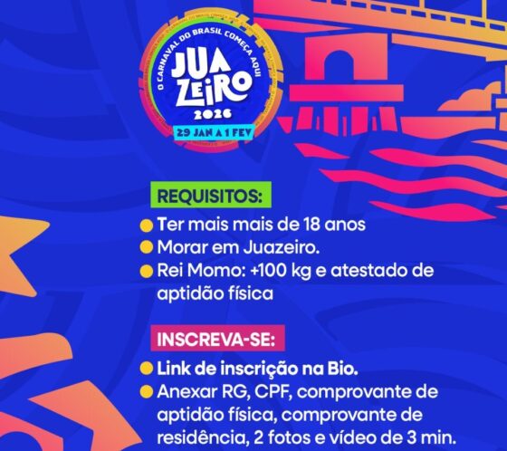 Ser Rei ou Rainha do Carnaval de Juazeiro vai além do brilho e da fantasia: é viver a festa de perto, representar a cultura popular, cumprir agenda oficial, receber premiação em dinheiro, adereços, fantasias e a chave da cidade, além de marcar o nome na história da folia momesca. Seguem abertas as inscrições para o Concurso de Rei Momo e Rainha do Carnaval 2026, promovido pela Prefeitura de Juazeiro, por meio da Secretaria de Cultura, Turismo e Esportes (Seculte).