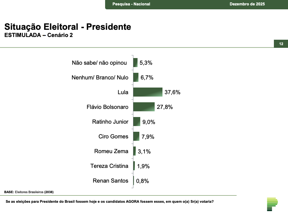 Ainda testando o primeiro turno, o segundo cenário aponta Lula na liderança com 37,6% contra 27,8% de Flávio Bolsonaro. Nesta simulação, Ratinho Junior tem 9%, Ciro 7,9%, Zema 3,1%, Tereza Cristina 1,9% e Renan Santos 0,8%.