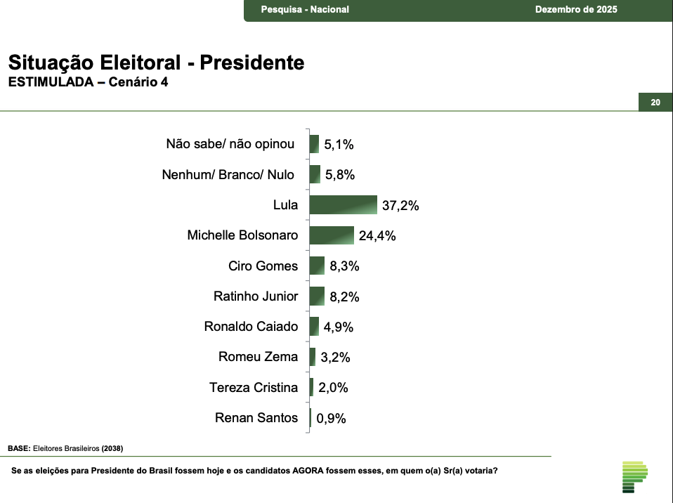 Um dos cenários estimulados apresentados pela pesquisa considera o ex-presidente Jari Bolsonaro como possível candidato. Atualmente inelegível e cumprindo pena de mais de 27 anos por tentativa de golpe de estado, ele soma 31,3% frente a 36,9% de Lula.
