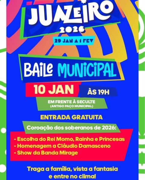 O clima de Carnaval já tomou conta de Juazeiro com a realização do Baile Municipal, que acontece amanhã, 10 de janeiro, a partir das 19h, em frente à Secretaria de Cultura, Turismo e Esportes (Seculte), no antigo Paço Municipal. O evento, aberto ao público e com entrada gratuita, marca o início da contagem regressiva para a folia de 2026 e vai revelar os novos soberanos do Carnaval: Rei Momo, Rainha e Princesas.