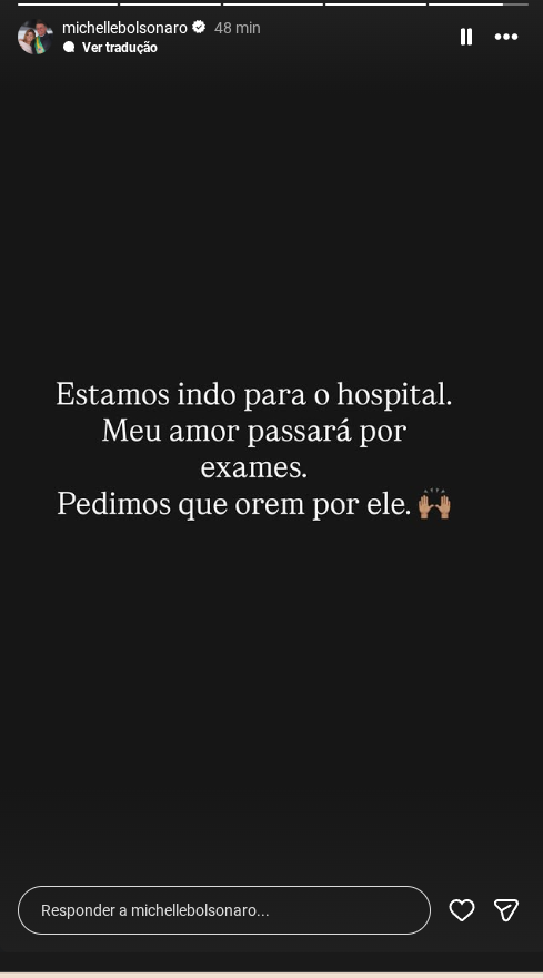 Em nova publicação, Michelle afirma que estão se dirigindo ao hospital. A informação foi confirmada pela PF.
