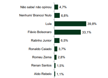 Na consulta espontânea, onde os nomes não são apresentados, Lula lidera com 25,5%, seguido por Jair Bolsonaro (12,1%) e Flávio Bolsonaro (6,3%). 44,2% dos eleitores afirmou que não sabe.