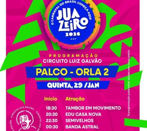 Começa nesta quinta-feira (29) a festa mais aguardada pelos foliões juazeirenses. O Carnaval de Juazeiro 2026 – “O Carnaval do Brasil começa aqui” abre oficialmente sua programação após grande expectativa, levando música, cultura e alegria para os circuitos Ivete Sangalo (Av. Adolfo Viana/Orla I) e Luiz Galvão (Orla II). Logo no primeiro dia, blocos tradicionais e grandes atrações prometem transformar a cidade em um grande palco de celebração popular.
