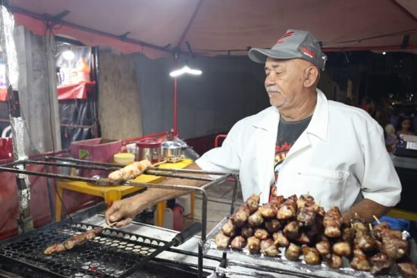 Também com mais de 30 anos de experiência, Francisco Souza Neto trabalha ao lado da esposa na venda de espetinhos. “Eu já tive ponto fixo, mas o custo é alto e a gente fica preso ao local. Como ambulante, podemos levar nossos produtos para várias festas e, às vezes, lucrar mais em uma noite de evento do que em um ponto fixo”, relata.