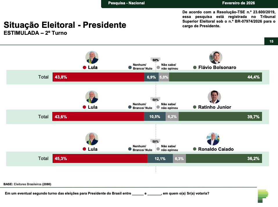 A pesquisa também simulou cenários de segundo turno. Em eventual disputa entre Lula e Flávio Bolsonaro, o levantamento aponta 43,8% das intenções de voto para Lula e 44,4% para Flávio Bolsonaro, com 6,9% de votos brancos ou nulos e 5% de indecisos, cenário que indica empate técnico.