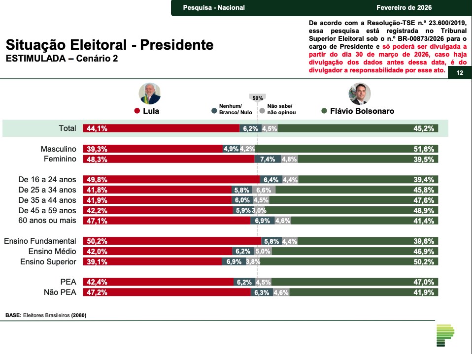 O levantamento também testou um segundo cenário, em confronto direto entre Lula e Flávio Bolsonaro. Nessa simulação, Flávio Bolsonaro aparece com 45,2%, enquanto Lula marca 44,1%. Os que afirmaram votar em branco, nulo ou em nenhum dos dois são 6,2%, e 4,5% não souberam ou não responderam.
