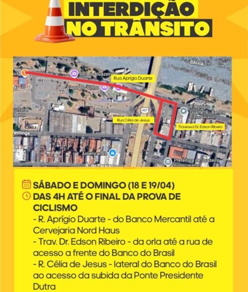 No sábado (18) e domingo (19), a partir das 4h até o término da prova de ciclismo, importantes vias do Centro de Juazeiro estarão interditadas para garantir a segurança dos participantes: