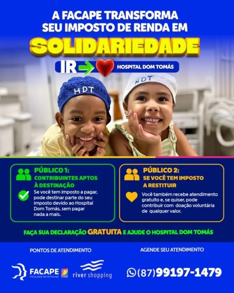 Serviço: O procedimento é simples e pode ser realizado de forma on-line ou presencial. Os interessados podem entrar em contato com a equipe por meio do WhatsApp (87) 99197-1479 a partir da quarta-feira (22) . Durante o atendimento remoto, será feito o preenchimento da declaração do Imposto de Renda e fornecidas as orientações para a destinação de parte do imposto ao Hospital Dom Tomás.