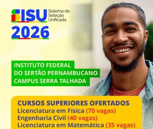 O campus Serra Talhada do IFSertãoPE ofertará mais de 140 vagas para cursos de nível superior por meio do Sistema de Seleção Unificada (SiSU) 2026. Desse total, 70 vagas serão destinadas ao curso de L...